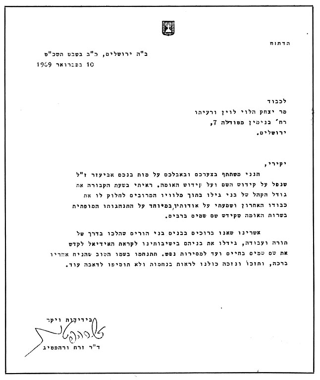 מכתב תנחומים - ד"ר זרח ורהפטיג